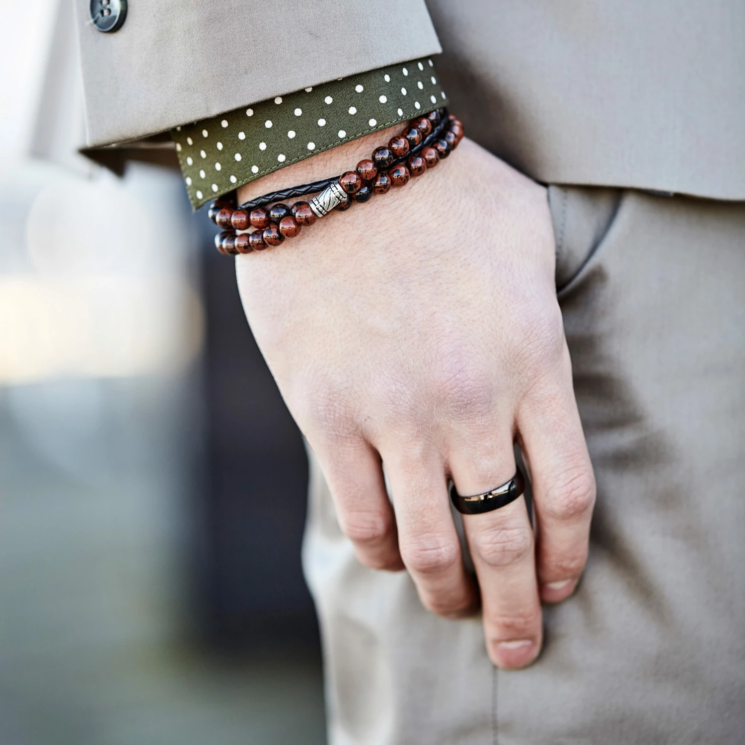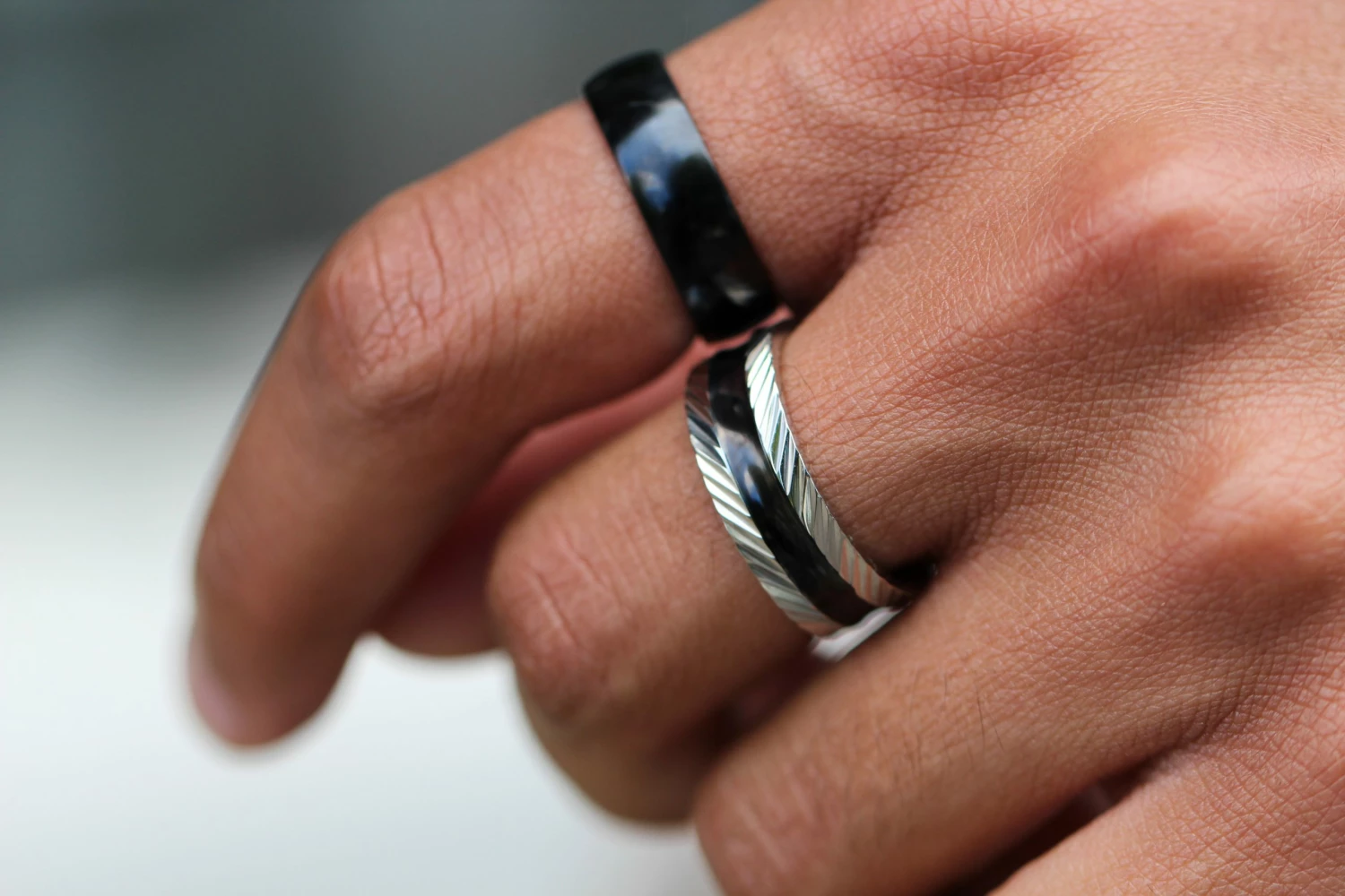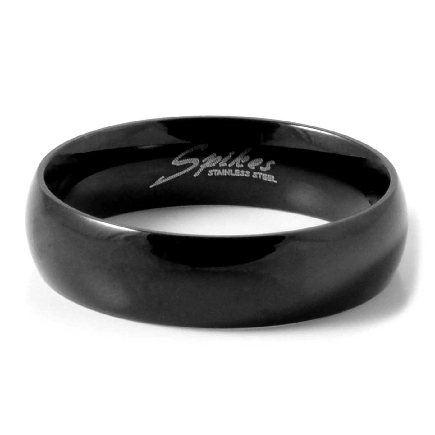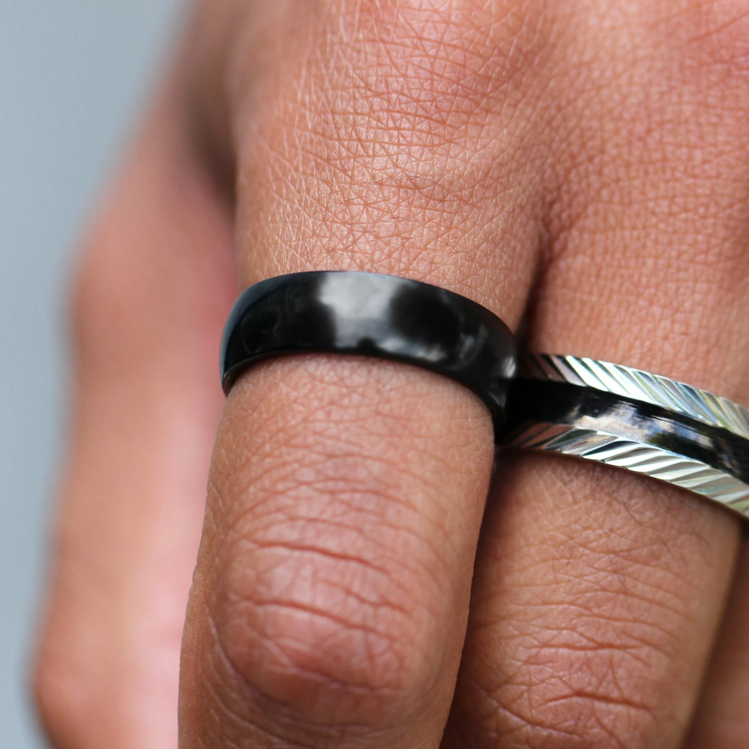Un anneau en acier noir avec un aspect traditionnel élégant.