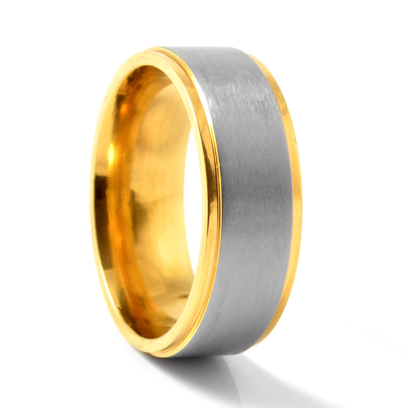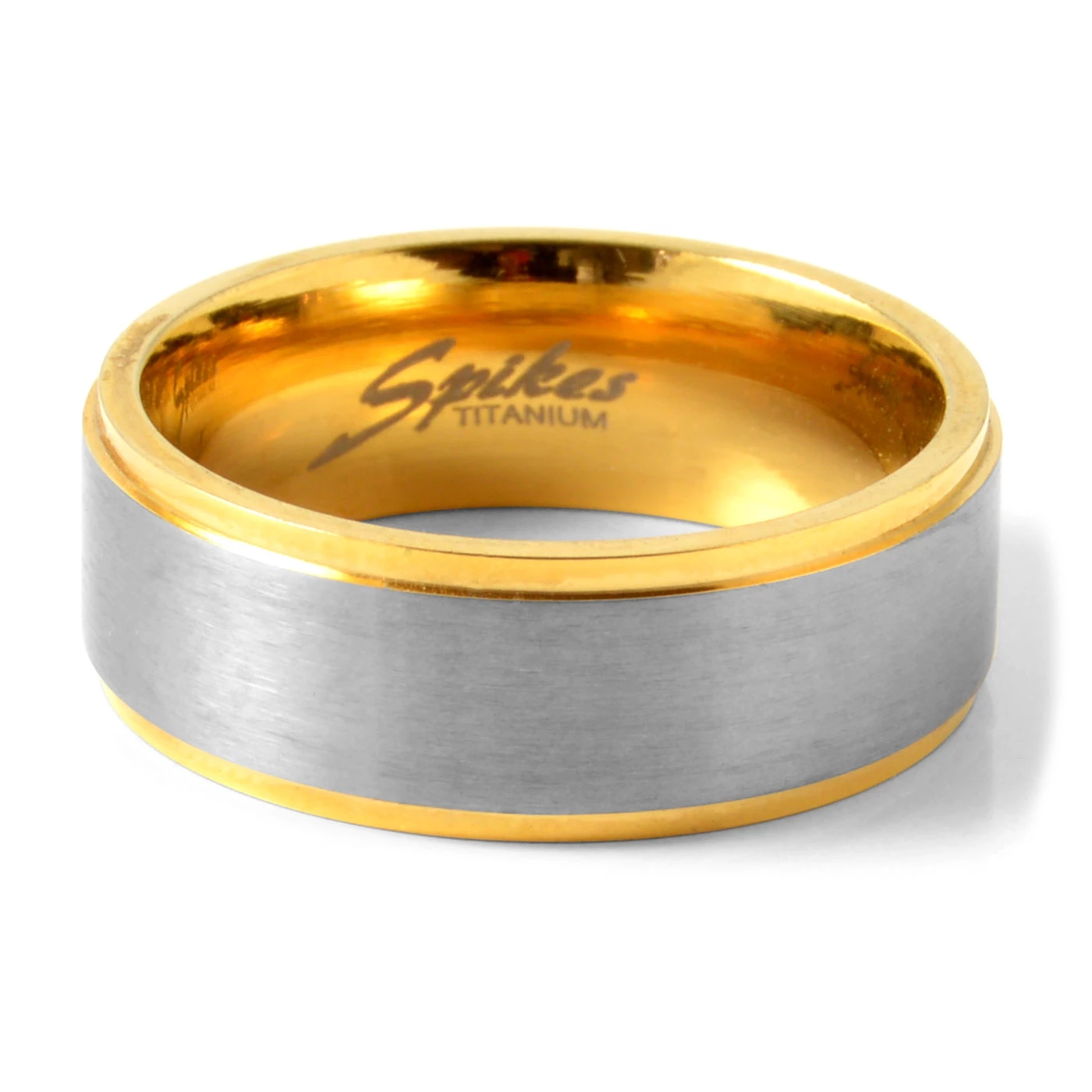 Cet anneau en titane doré est décoré d’une bande en titane brossé gris mat. Une combinaison de couleurs très élégante.