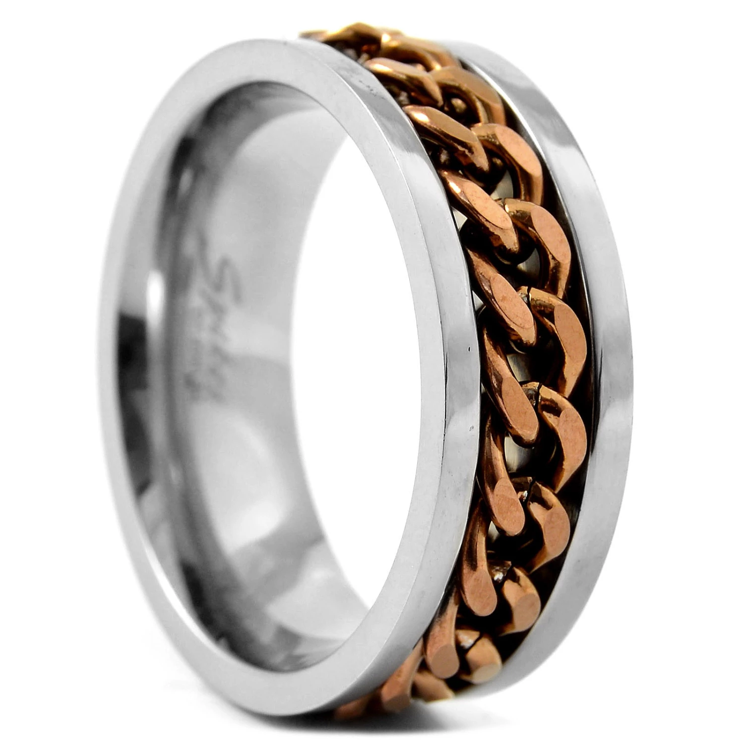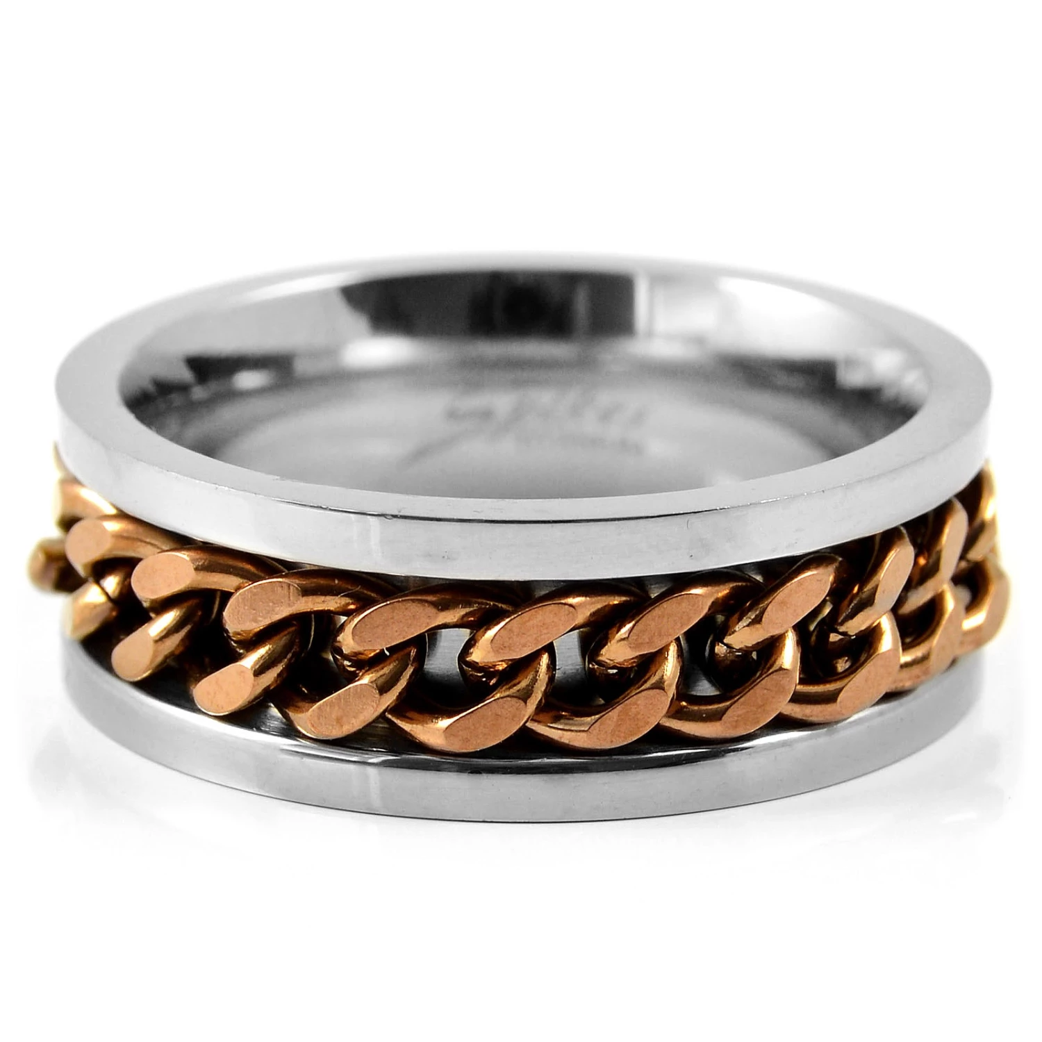 Cette bague en titane couleur argent est très originale avec une chaîne marron incrustée tout le long de l’anneau.