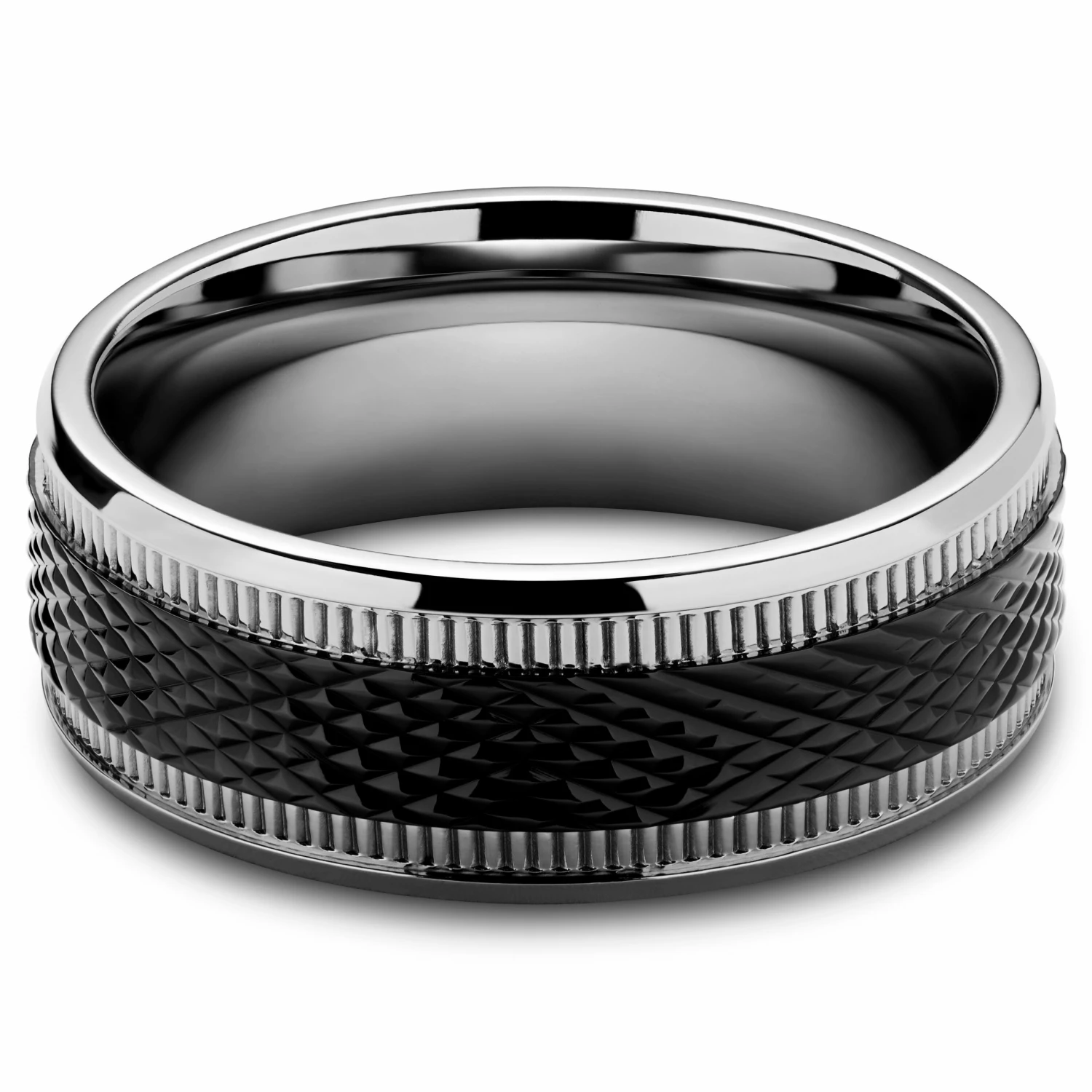 La couleur noire des motifs en fibre de carbone est obtenue à l’aide d’un dépôt physique en phase vapeur, un processus qui consiste à surchauffer le nitrure de titane jusqu’à son état plasma et à le projeter à la surface de l’anneau à l’intérieur d’une chambre à vide. Le résultat est une couche de céramique ultra-mince, résistante aux rayures et dure, qui ne s’écaillera pas avec le temps. Le processus de PVD est aussi plus respectueux de l’environnement que les autres méthodes de revêtement et de placage.