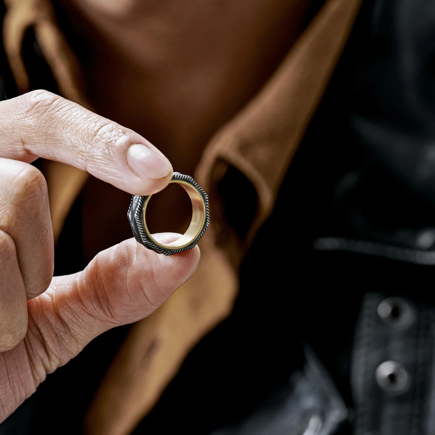 Cette bague est recouverte d’un revêtement PVD. Du nitrure de titane surchauffé est projeté sur l’anneau à l’intérieur d’une chambre à vide, fusionnant avec le métal au niveau moléculaire. Très peu de matériau est gaspillé et aucun liquide toxique n’est déversé, ce qui rend ce processus bien meilleur pour l’environnement que les autres traitements de surface. La couche ultra-mince ainsi formée résistera aux rayures et au ternissement et ne se décolorera ni ne s’écaillera pas.