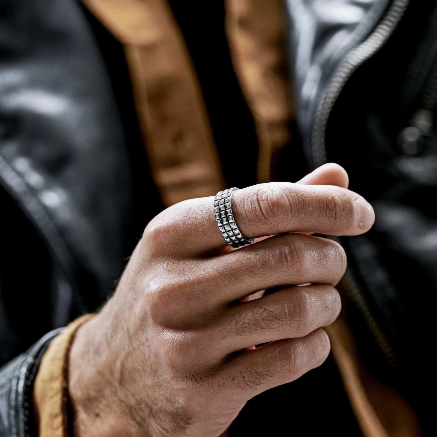 L’anneau Pyramis ressemble à une vis moletée, il est impossible de ne pas vouloir passer son doigt à sa surface Le cadeau parfait pour l’homme qui ne peut pas s’empêcher de jouer avec ses bagues. Le sommet de chacune des pyramides qui composent sa surface a été lissé afin de le rendre très confortable à porter. Un design brut pour un confort exceptionnel.