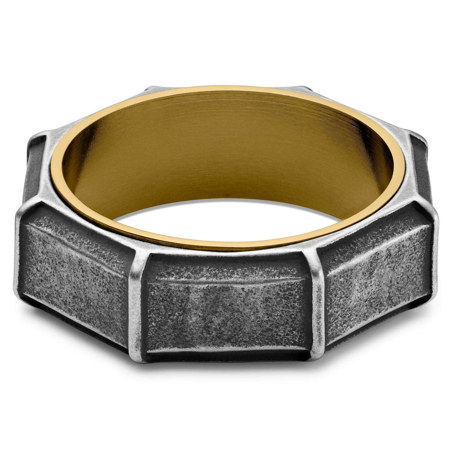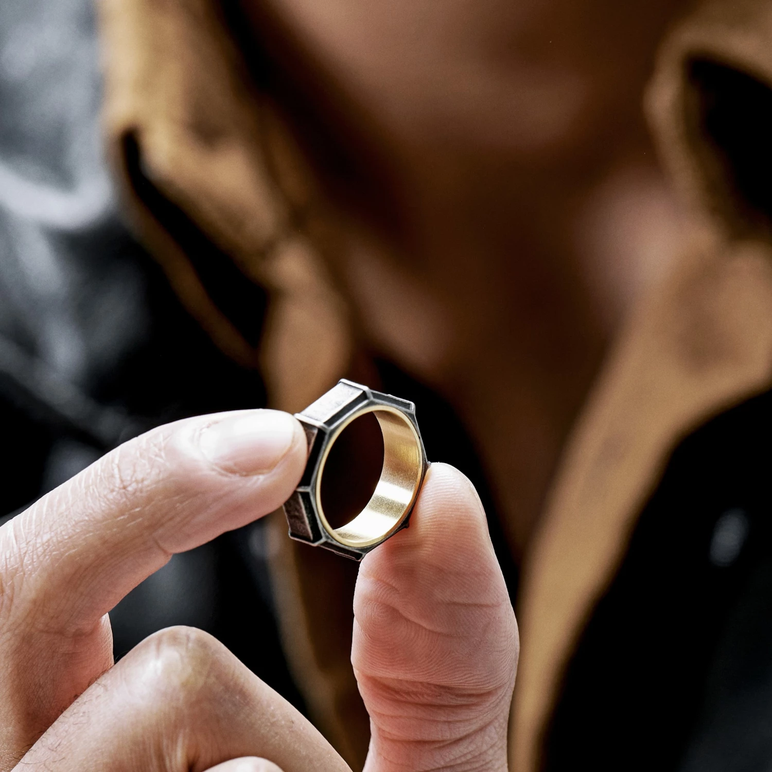 Entrez dans l’octogone. Ou peut-être serait-ce une mauvaise idée. Car après tout, cet anneau aux arêtes saillantes pourrait être classé dans la catégorie des armes contondantes. Un accessoire au design brut pour un look des plus élaborés.