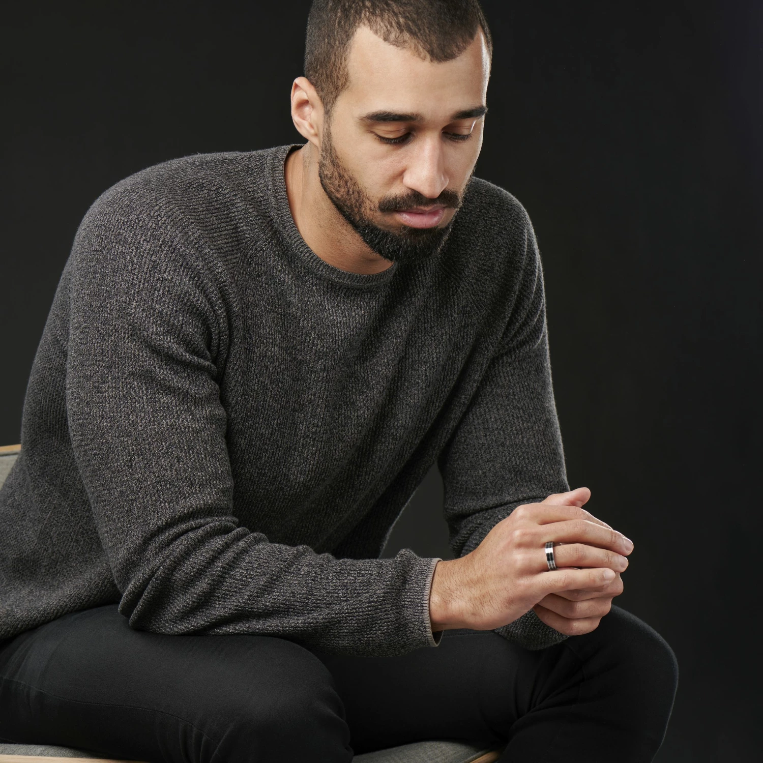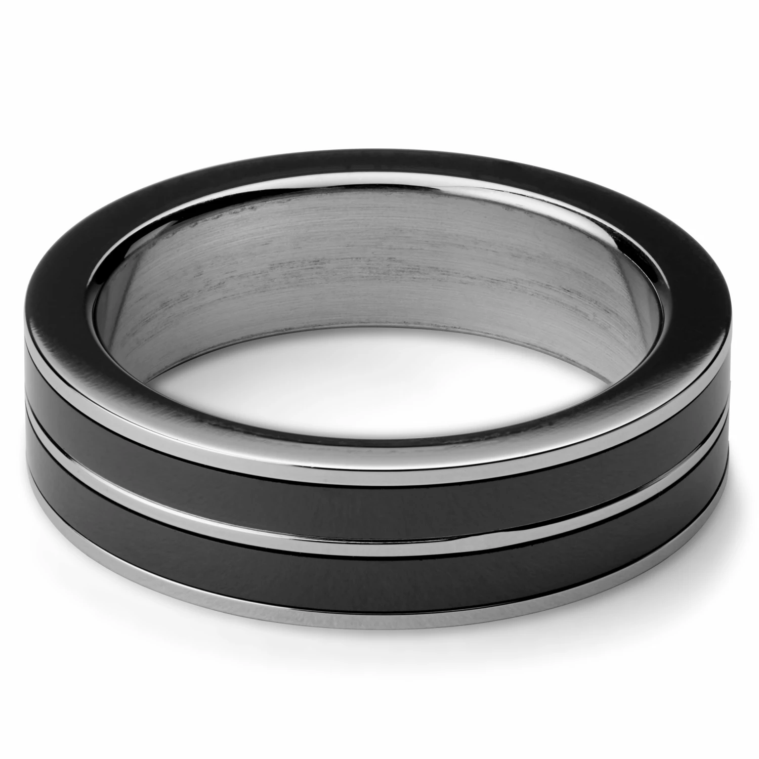 Avec ses fines bandes noires, cette bague argentée allie la force de l’acier à la durabilité de la céramique. Le résultat est une bague élégante qui ne se déformera pas après avoir été portée… et qui aura fière allure peu importe avec quoi vous la portez.