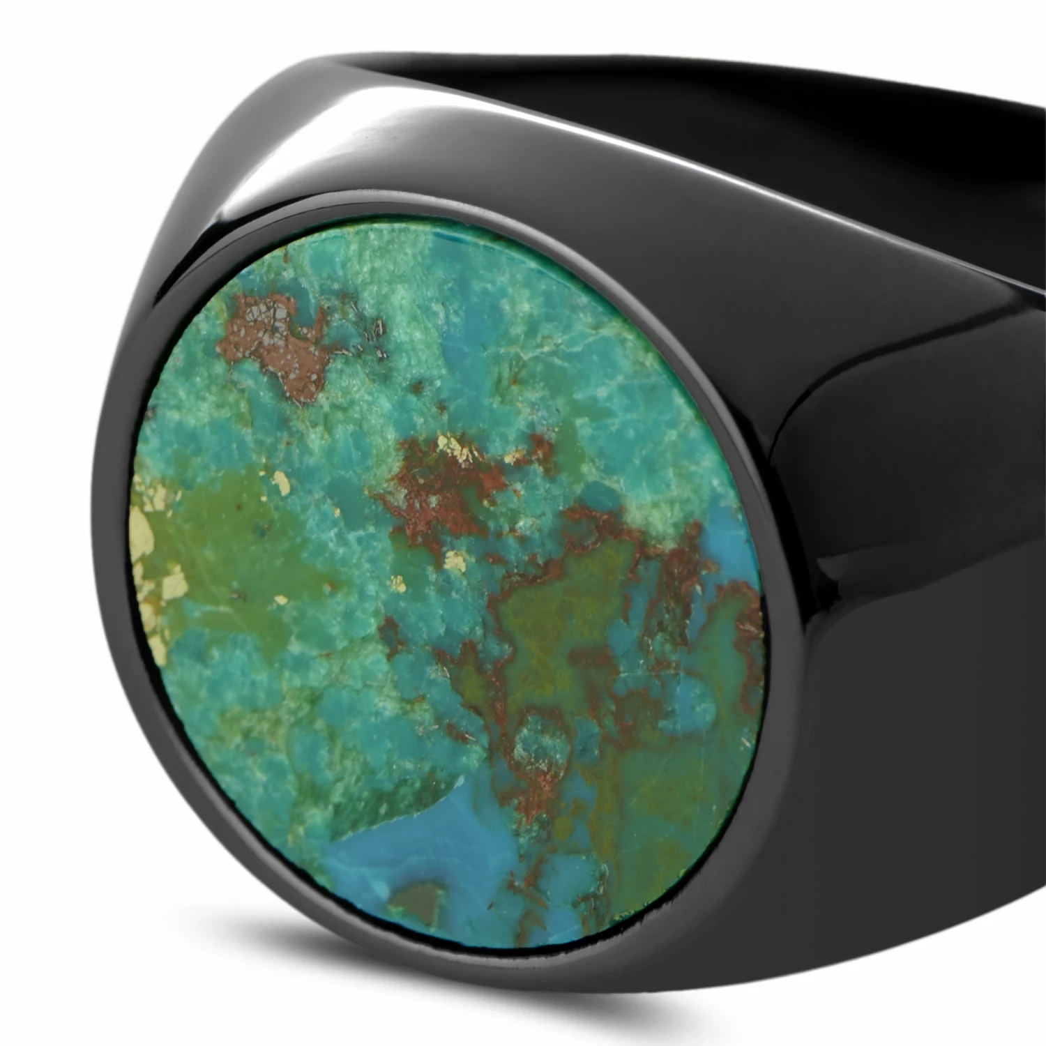 Sa pierre de couleur turquoise est mise en valeur par de l’acier inoxydable couleur gunmetal. Une nouvelle manière de définir le terme « bague masculine classique ».