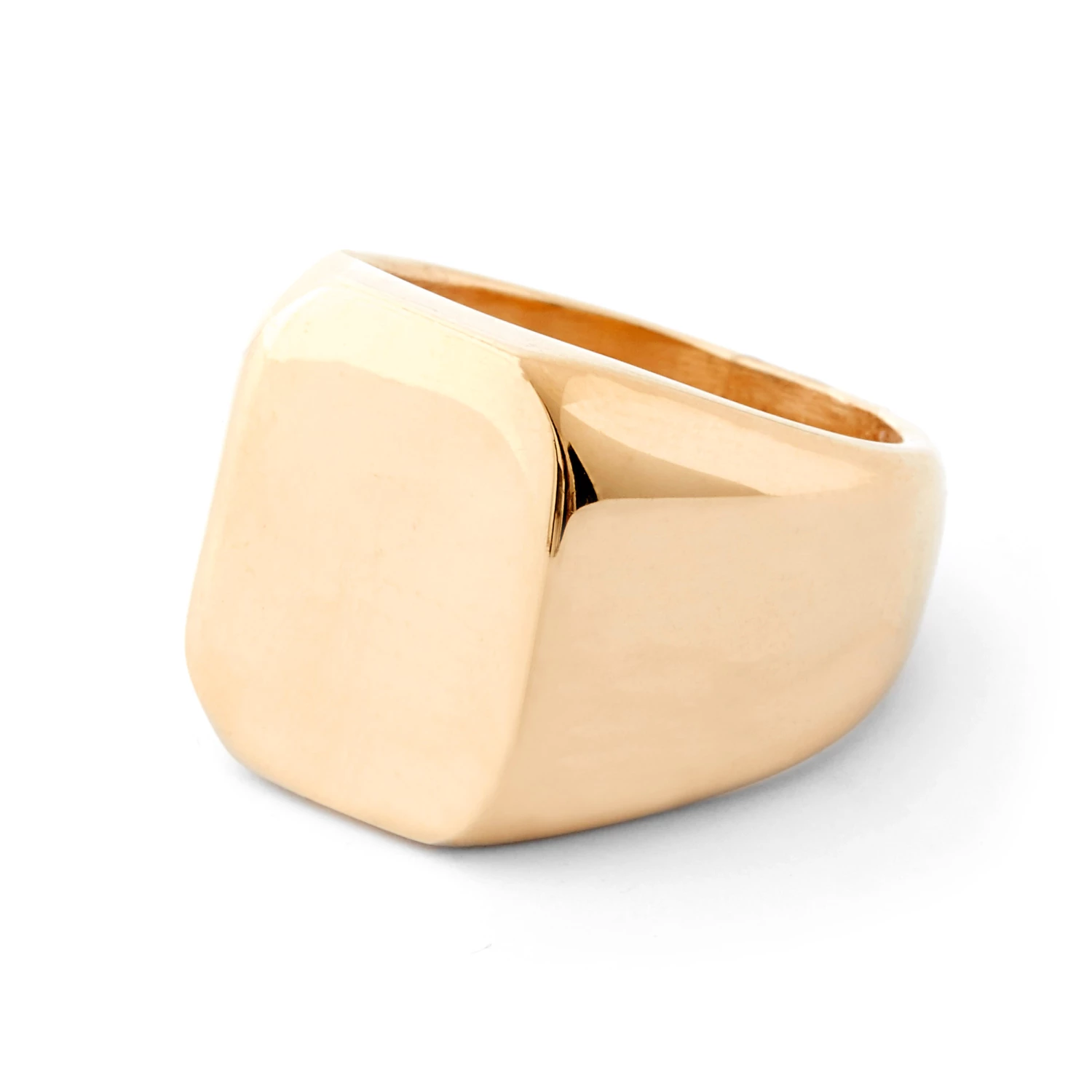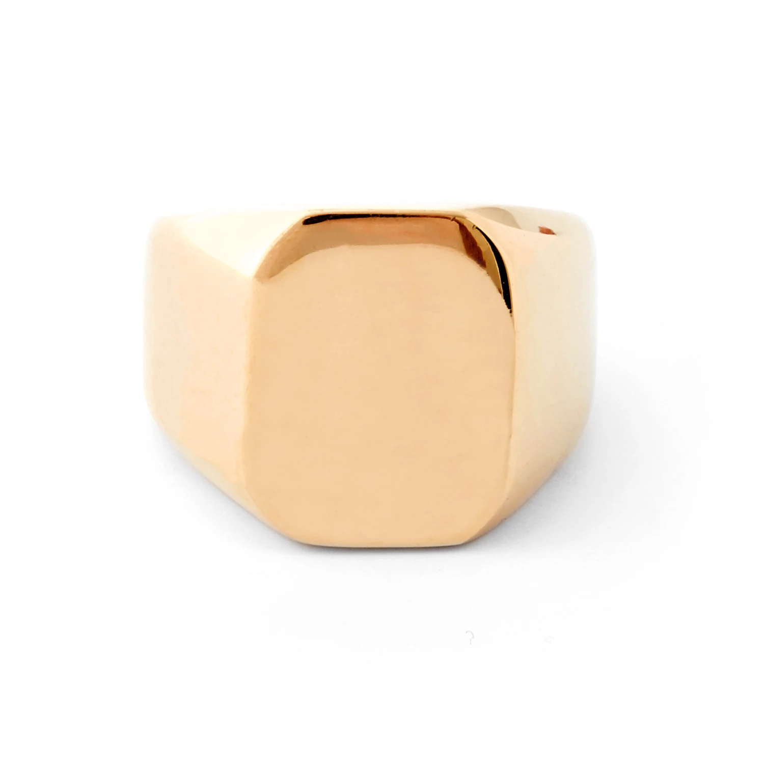 Une chevalière de couleur or rose de grande taille surmontée d’une chaton de forme carrée.