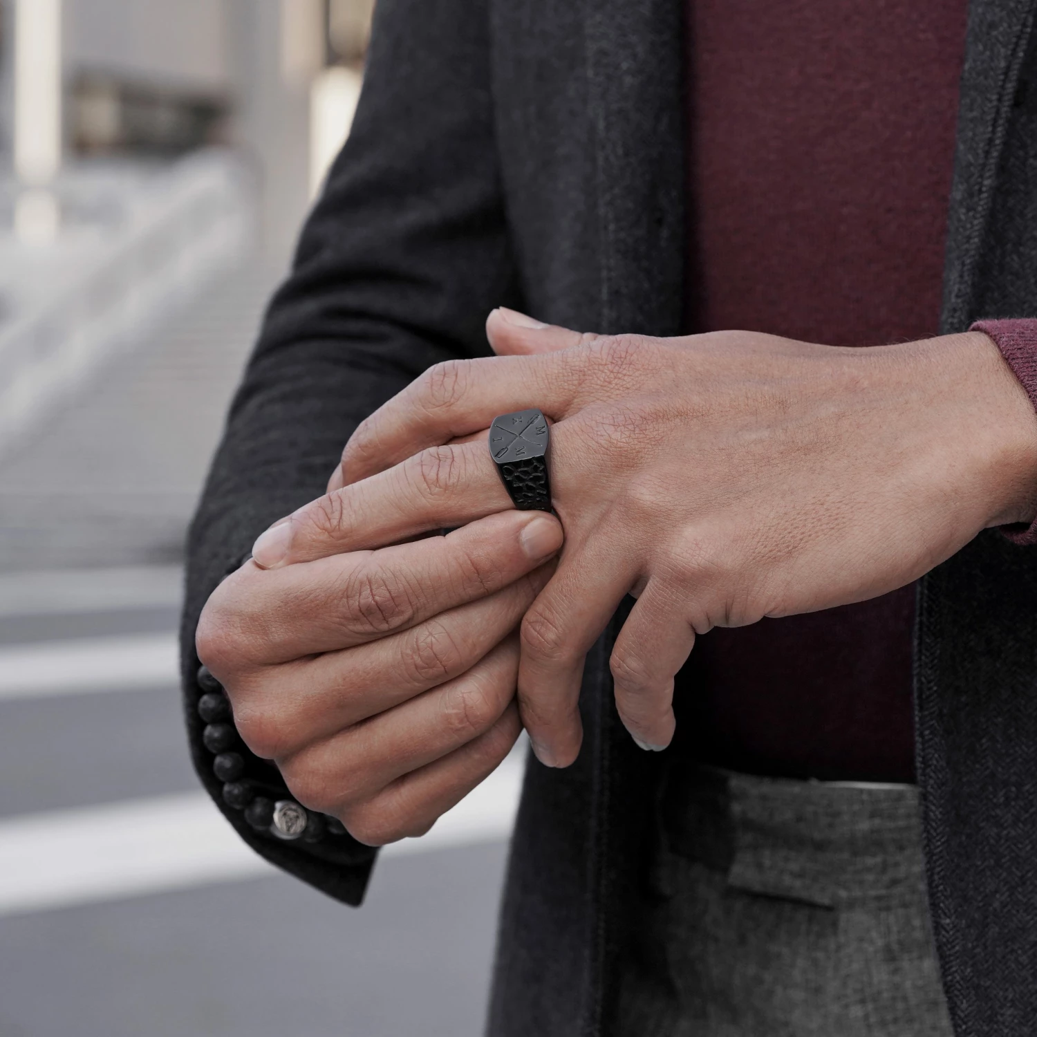 Une bague moderne et élégant à la finition détaillée. Cette chevalière noire allie subtilement un design moderne à des détails de finition classiques.
