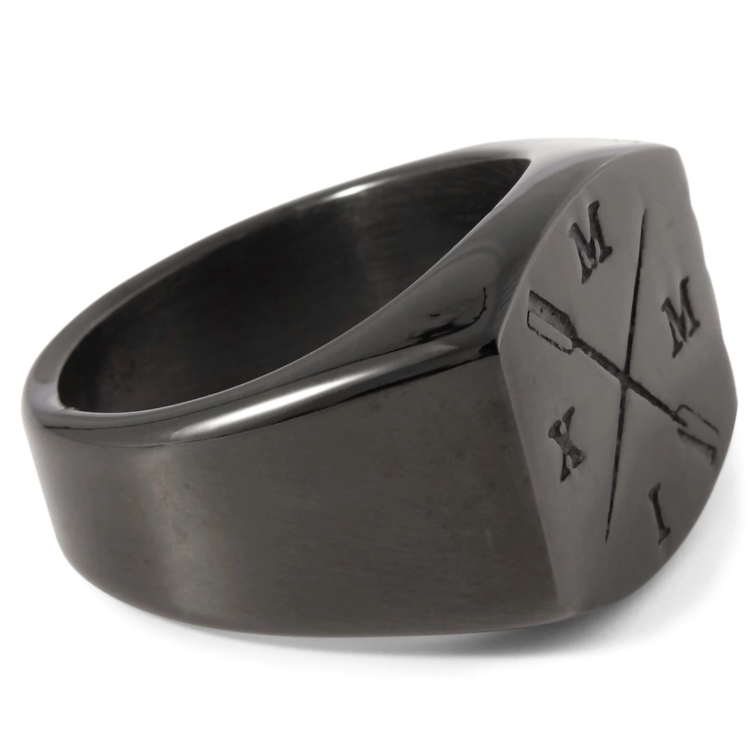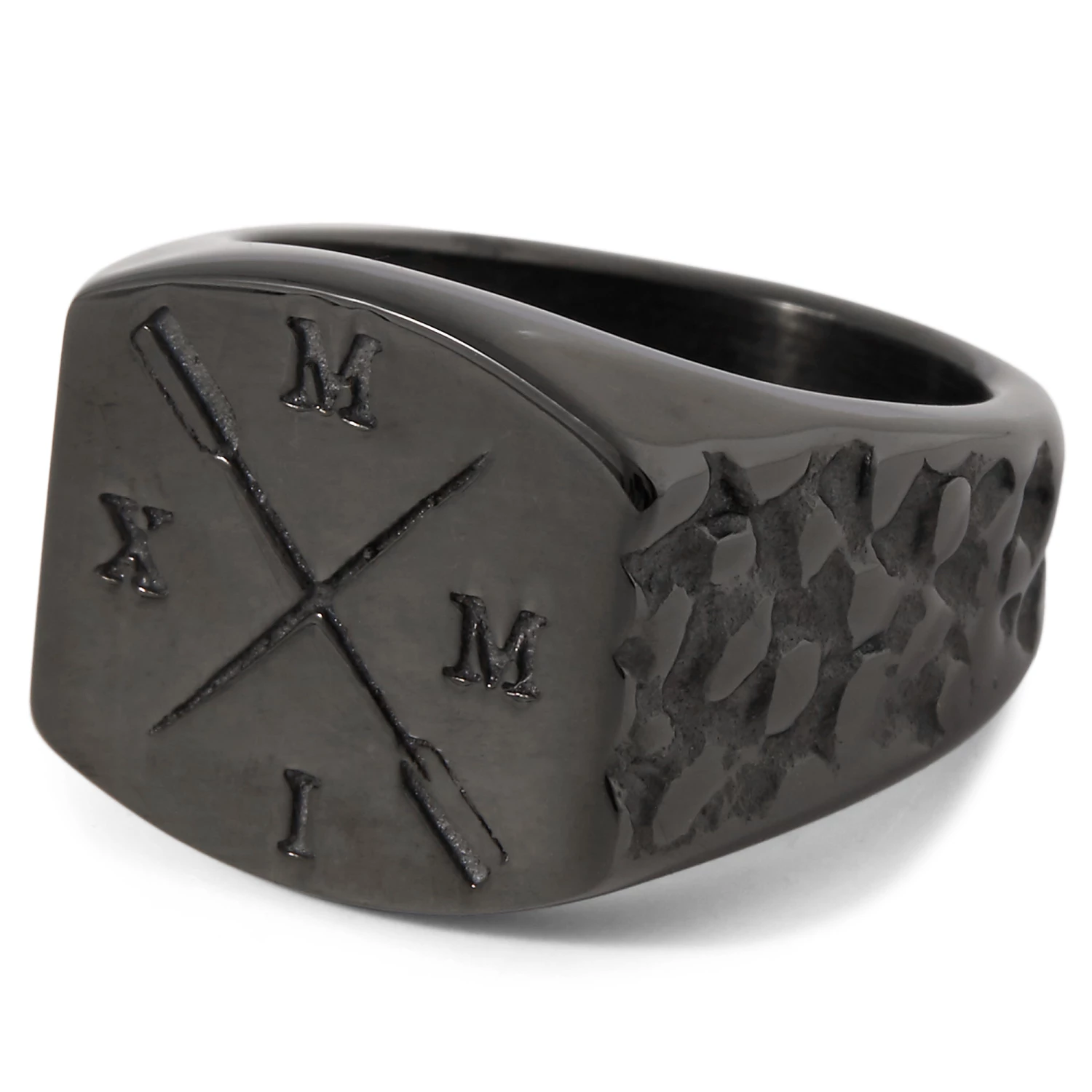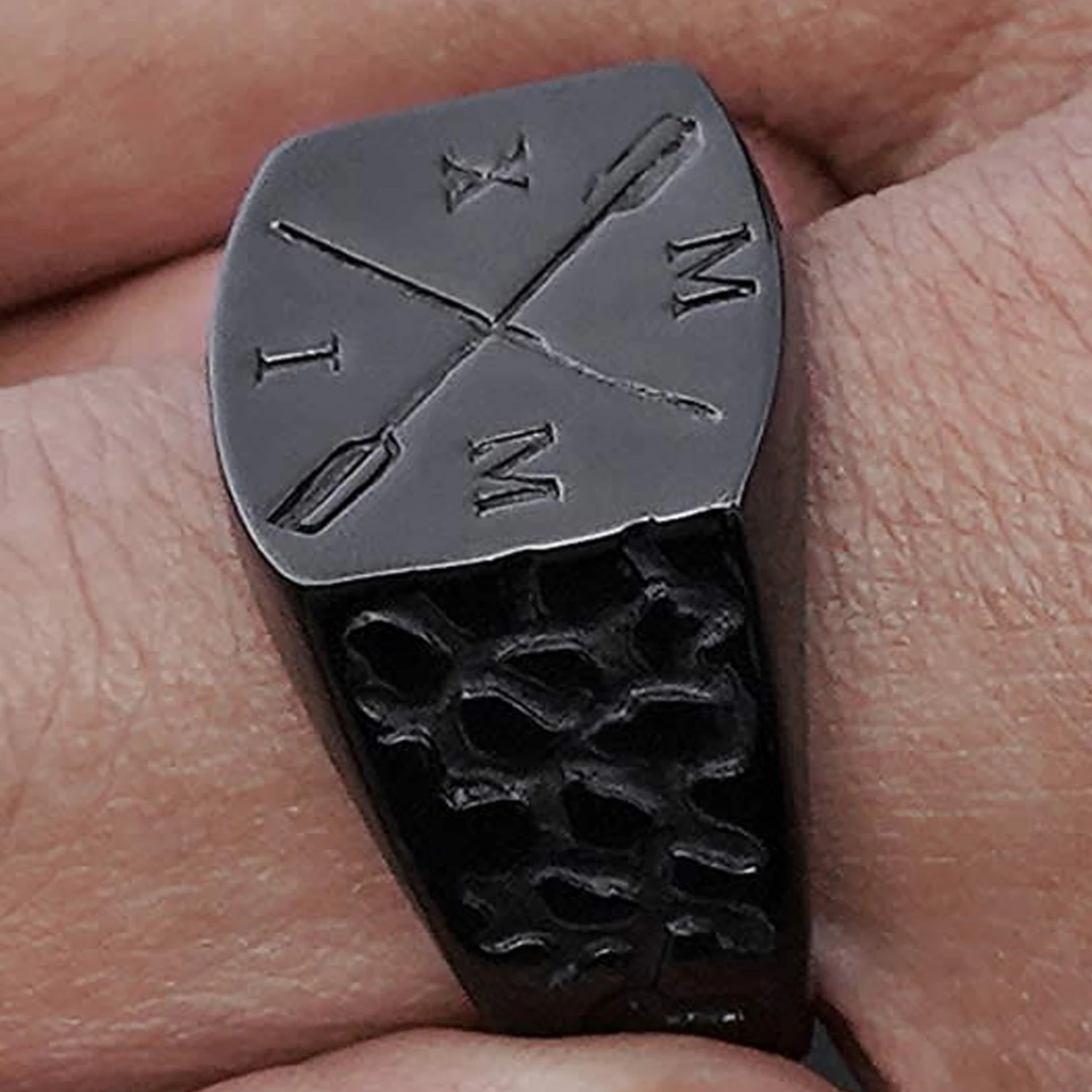 Solide et durable, la face avant de cette chevalière en acier inoxydable noir est gravée de rames (d’avirons) entrecroisés et ses parois latérales sont gravées de motifs texturés rugueux.