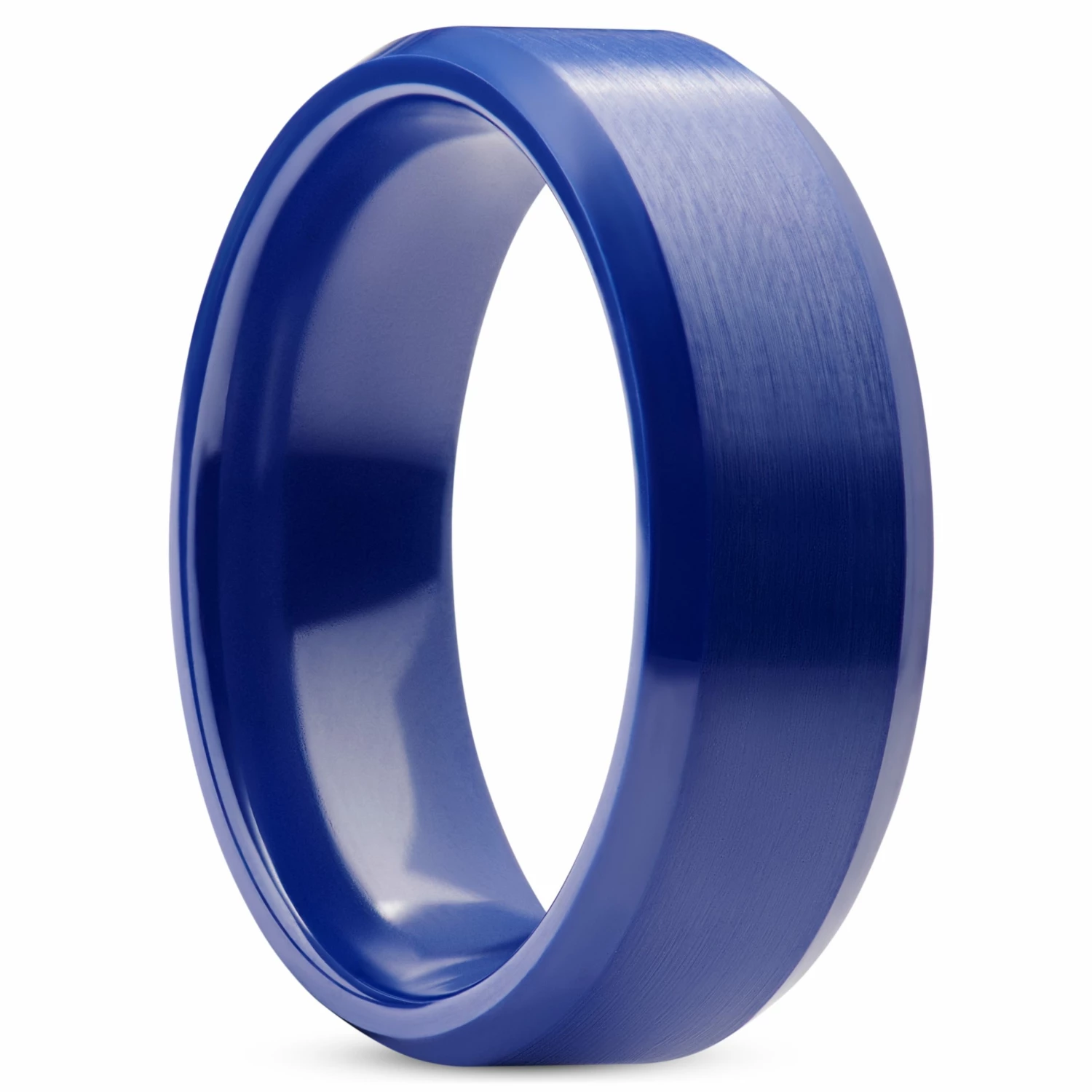 La section centrale de cet anneau bleu en céramique pour homme arbore une finition brossée qui contraste élégamment avec ses bords biseautés polis.