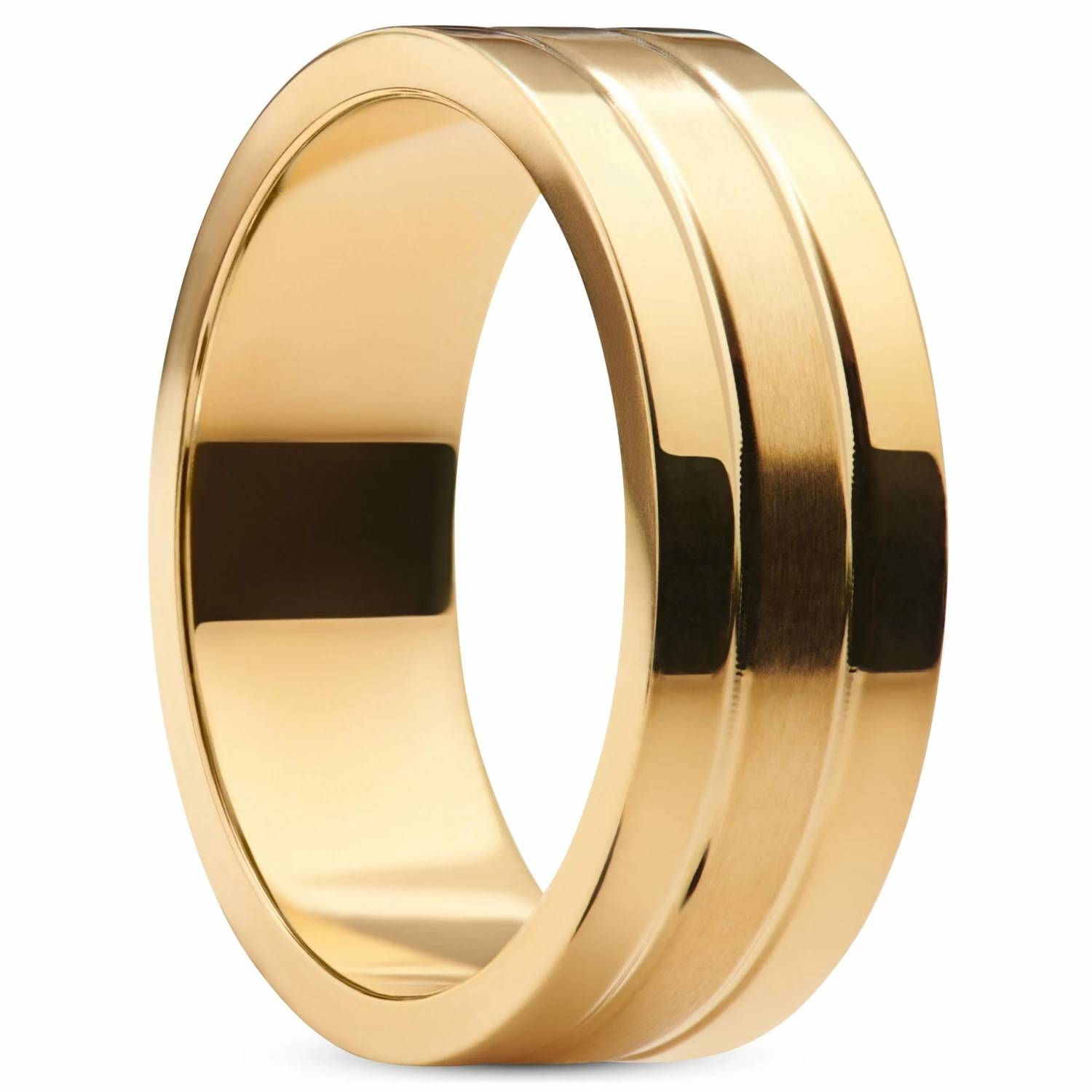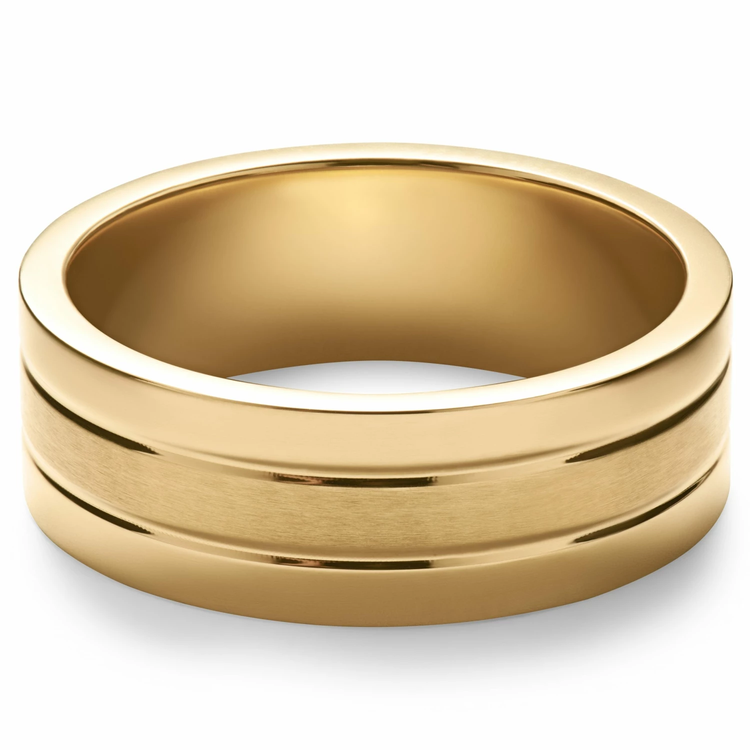 Un magnifique anneau pour homme décoré de deux rainures découpées au laser, séparant une bande centrale en acier brossé de deux bandes d’acier poli, pour un résultat tout en contrastes.