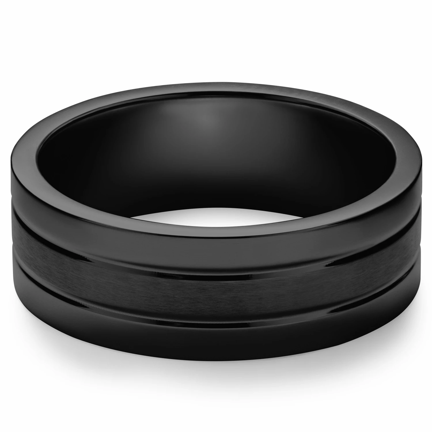 Un magnifique anneau pour homme décoré de deux rainures découpées au laser séparant une bande centrale en acier brossé de deux bandes d’acier poli, pour un résultat tout en contrastes.