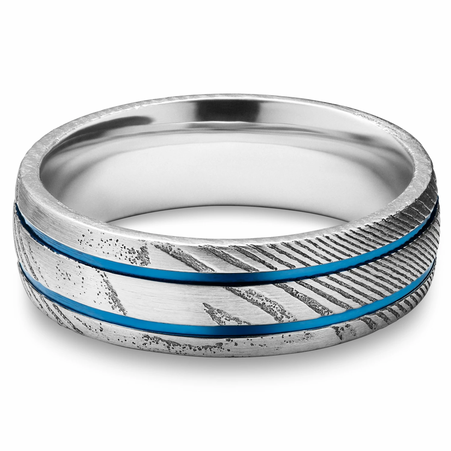 Cette bague est décorée de deux rainures qui courent sur toute sa circonférence pour un élégant mélange de tonalités bleues et argentées. Un revêtement PVD constitué de nitrure de titane fusionné à la surface du métal au niveau moléculaire lui offrira une résistance exceptionnelle aux rayures et au ternissement. La face interne est profilée et plaquée de titane, pour une sensation ultra-lisse très agréable contre la peau.