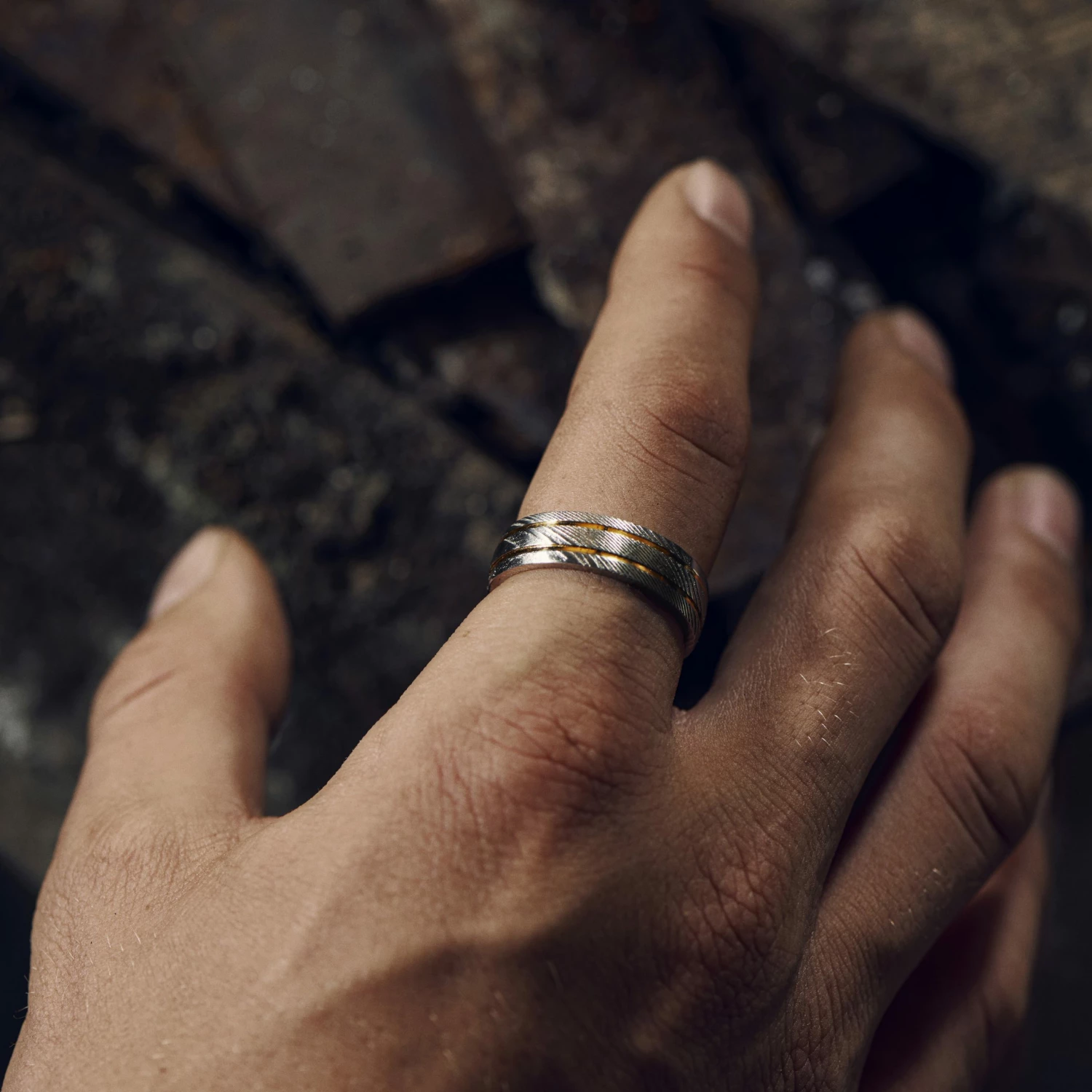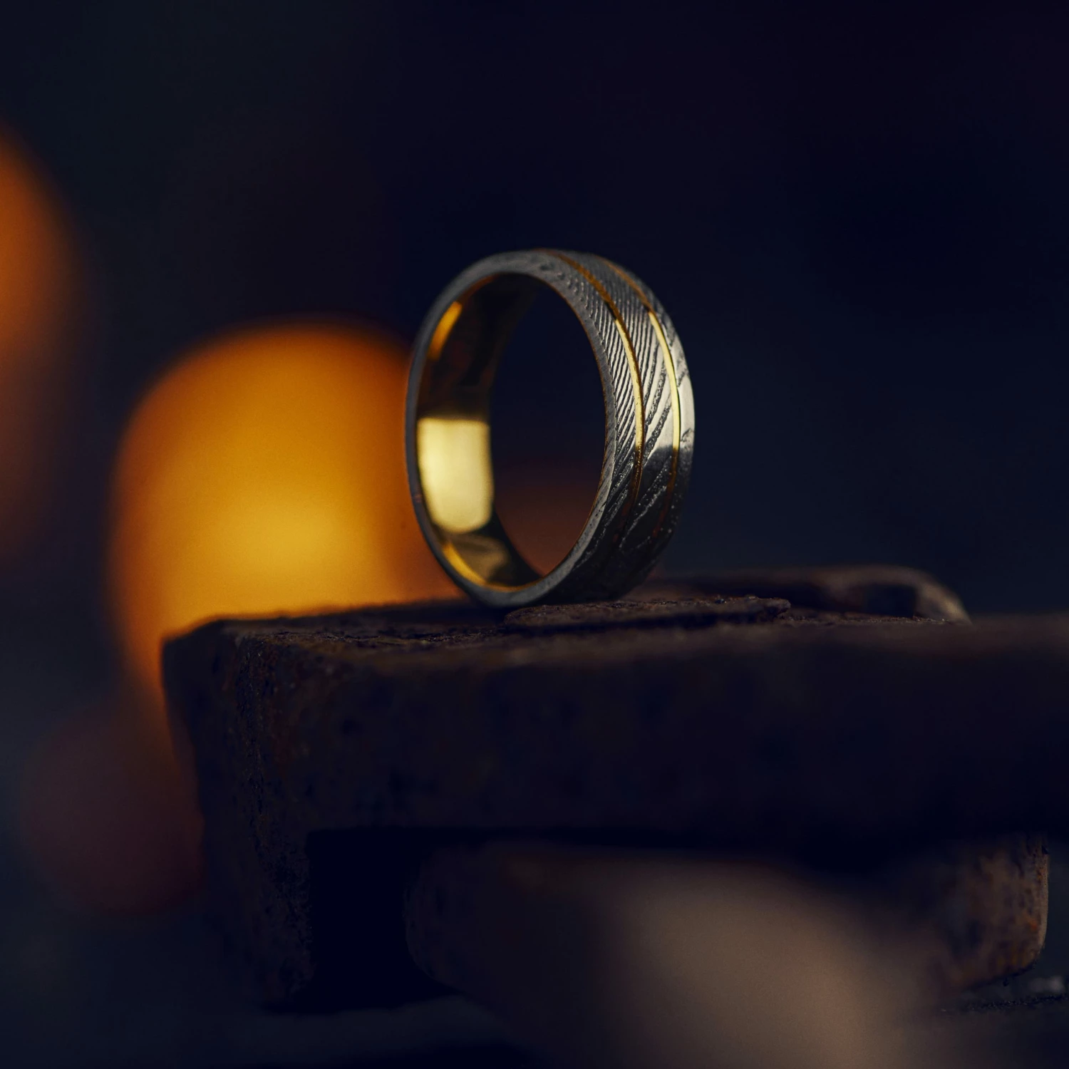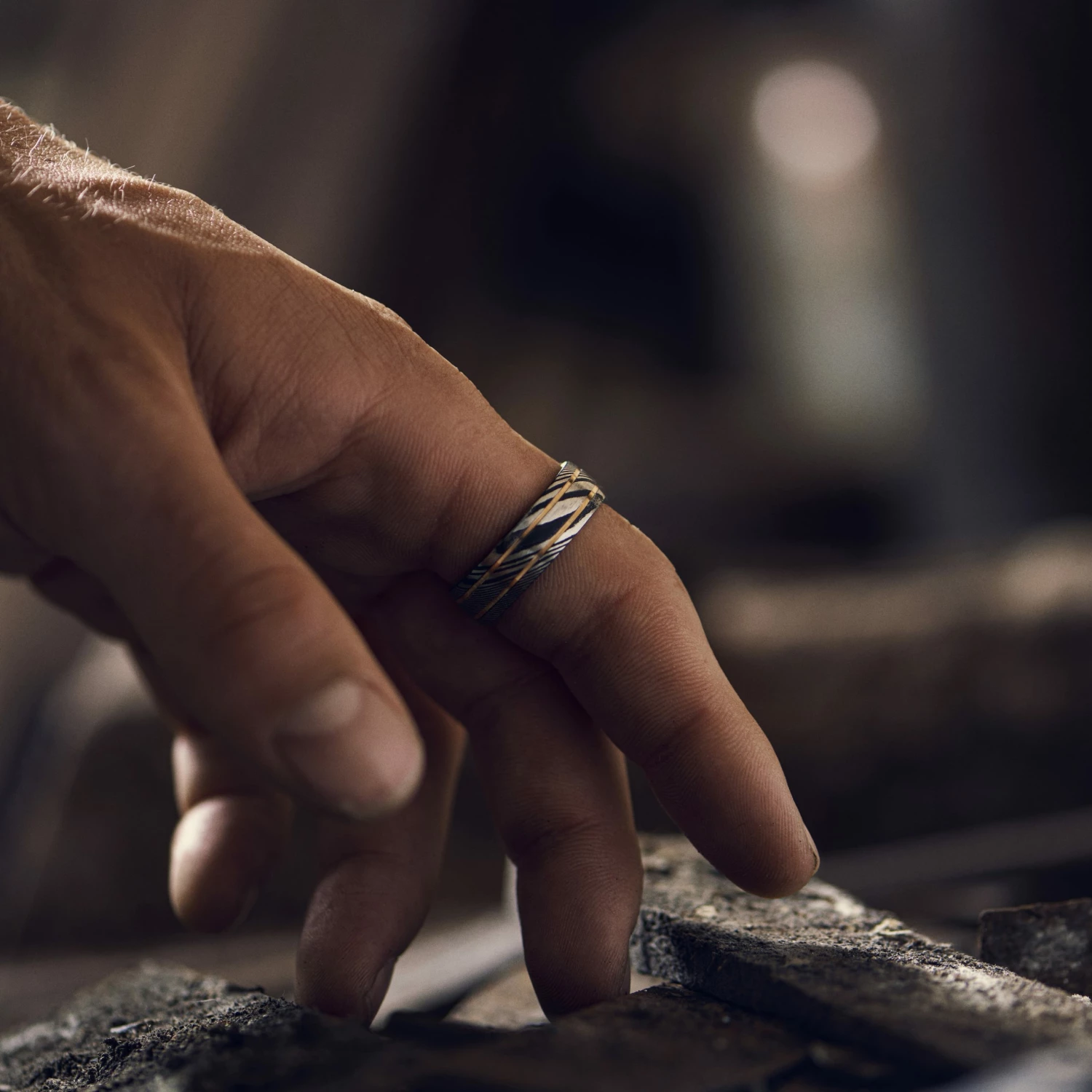 Au Moyen-Âge, les armes en acier de Damas étaient parmi les plus tranchantes disponibles. On disait que cet acier pouvait fendre une flèche en plein vol et conserver son tranchant pendant des mois. Cet alliage métallique est formé en forgeant deux types d’acier ensemble afin de créer un motif singulier : l’acier idéal pour obtenir une bague au look unique en son genre. Telle une empreinte digitale, elle n’appartiendra qu’à vous.
