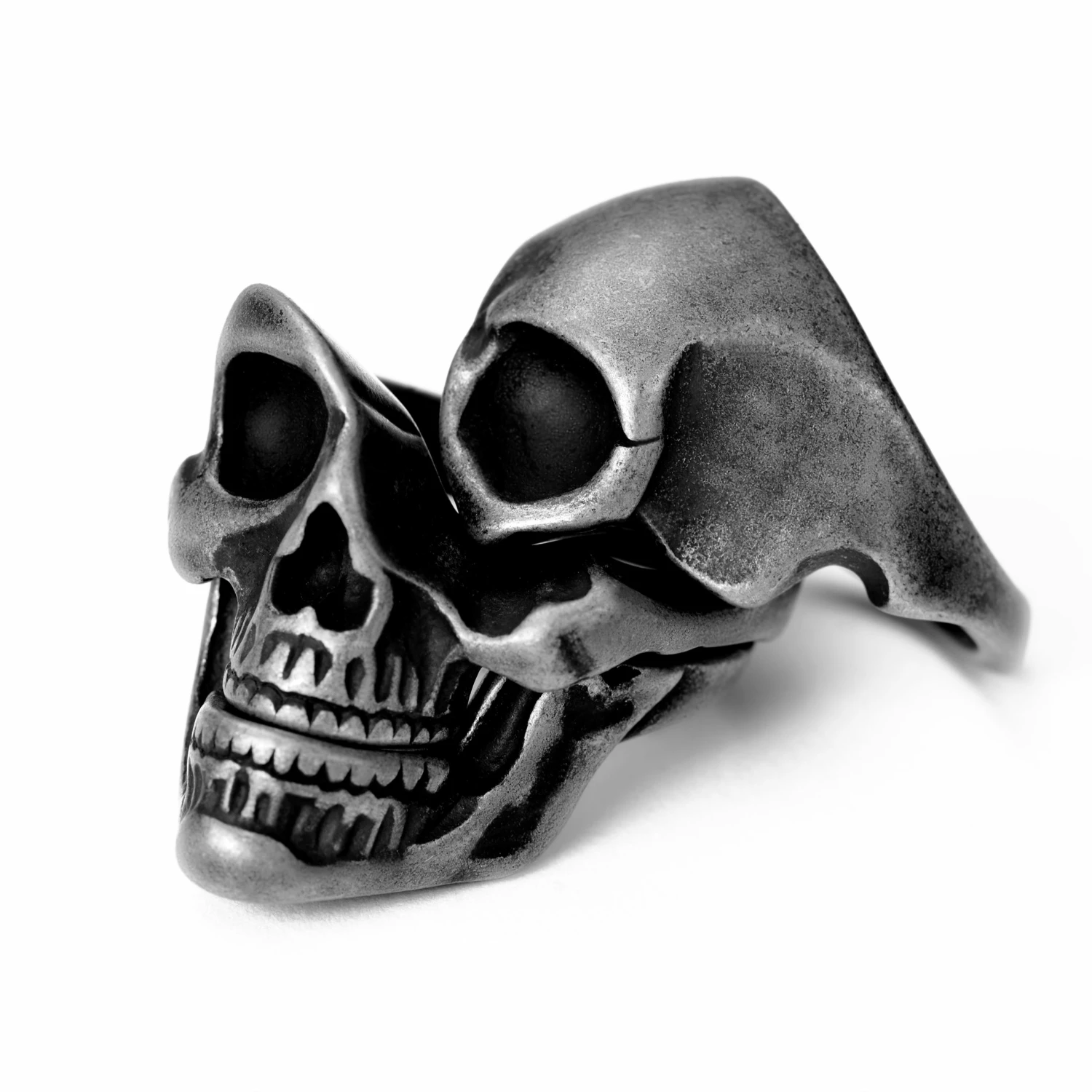 Trois anneaux composent cette bague au look extraordinaire – trois éléments qui se combinent pour former un crâne humain.