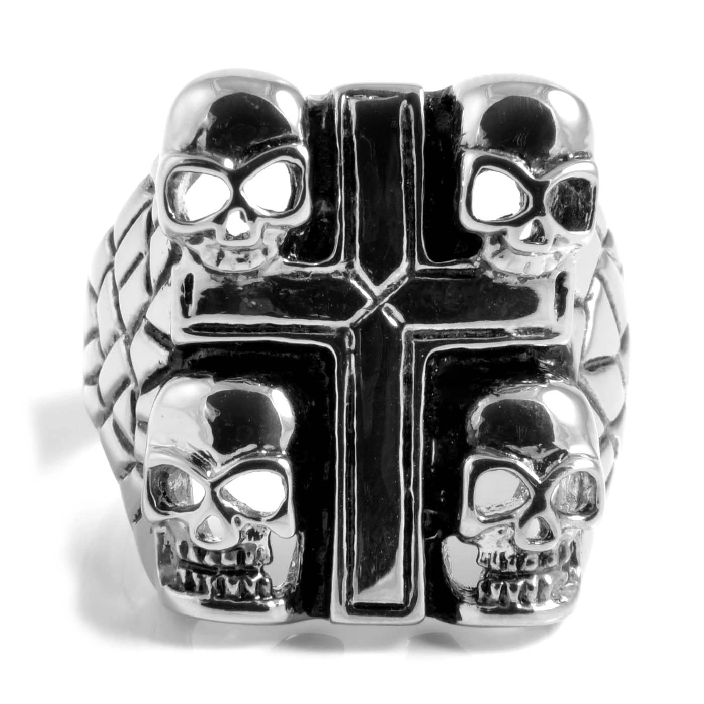 Cette bague très audacieuse et tout en détails se compose de quatre crânes posés sur un fond noir et réunis autour d’une grande croix épurée.