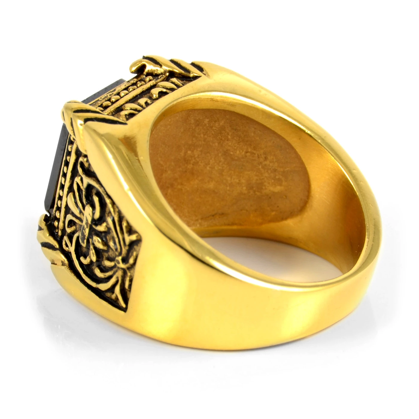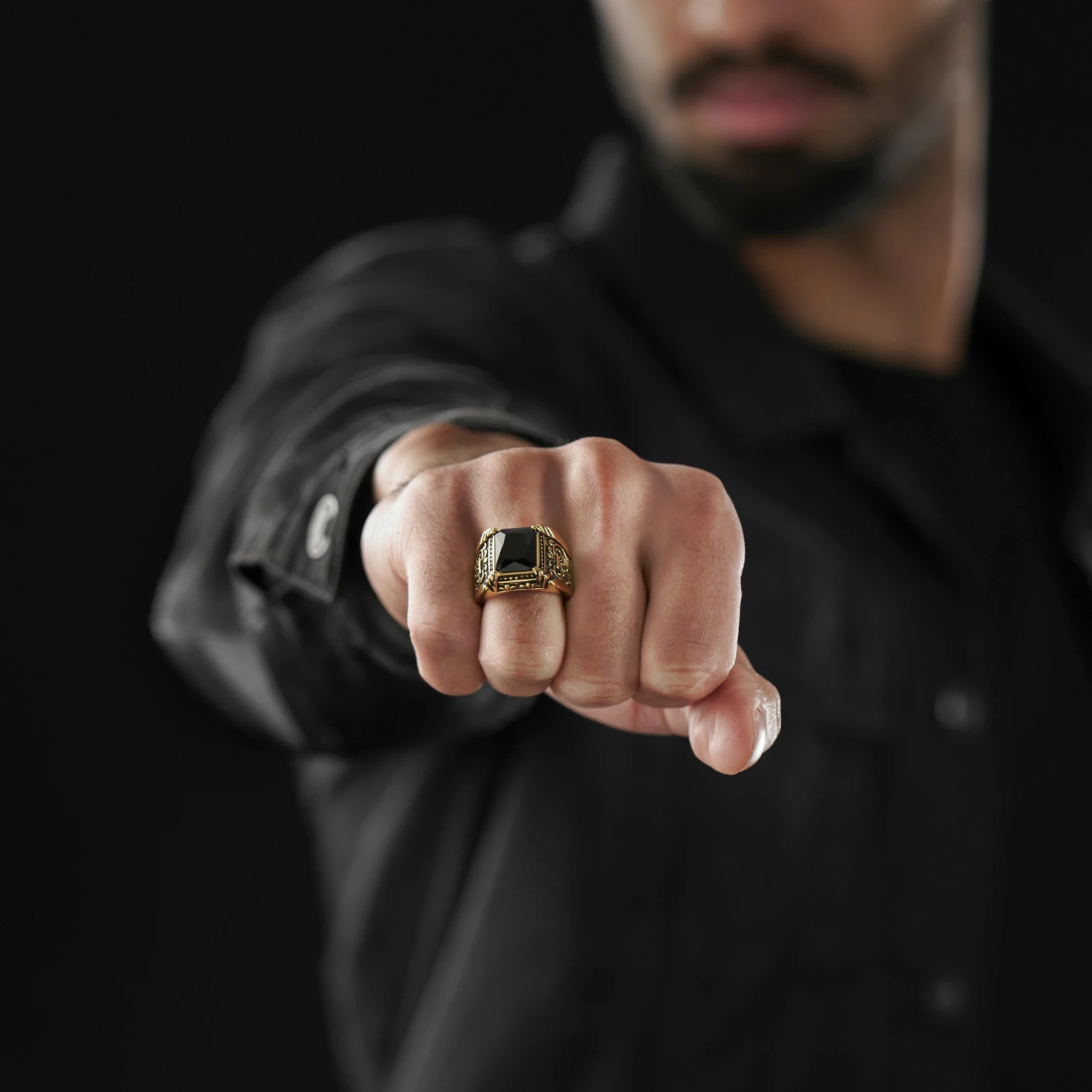 Cette bague doré est décorée de détails peints et sertie d’une large pierre noire (zirconium) à son sommet.