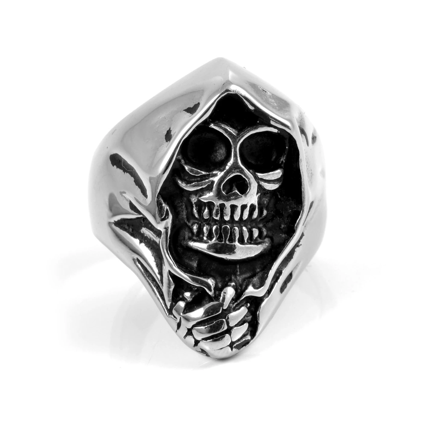 Le design de l’anneau est une tête de mort, ce style d’anneau revient à la mode. Nombreuses sculptures et petits détails peints en noir. Très masculin.