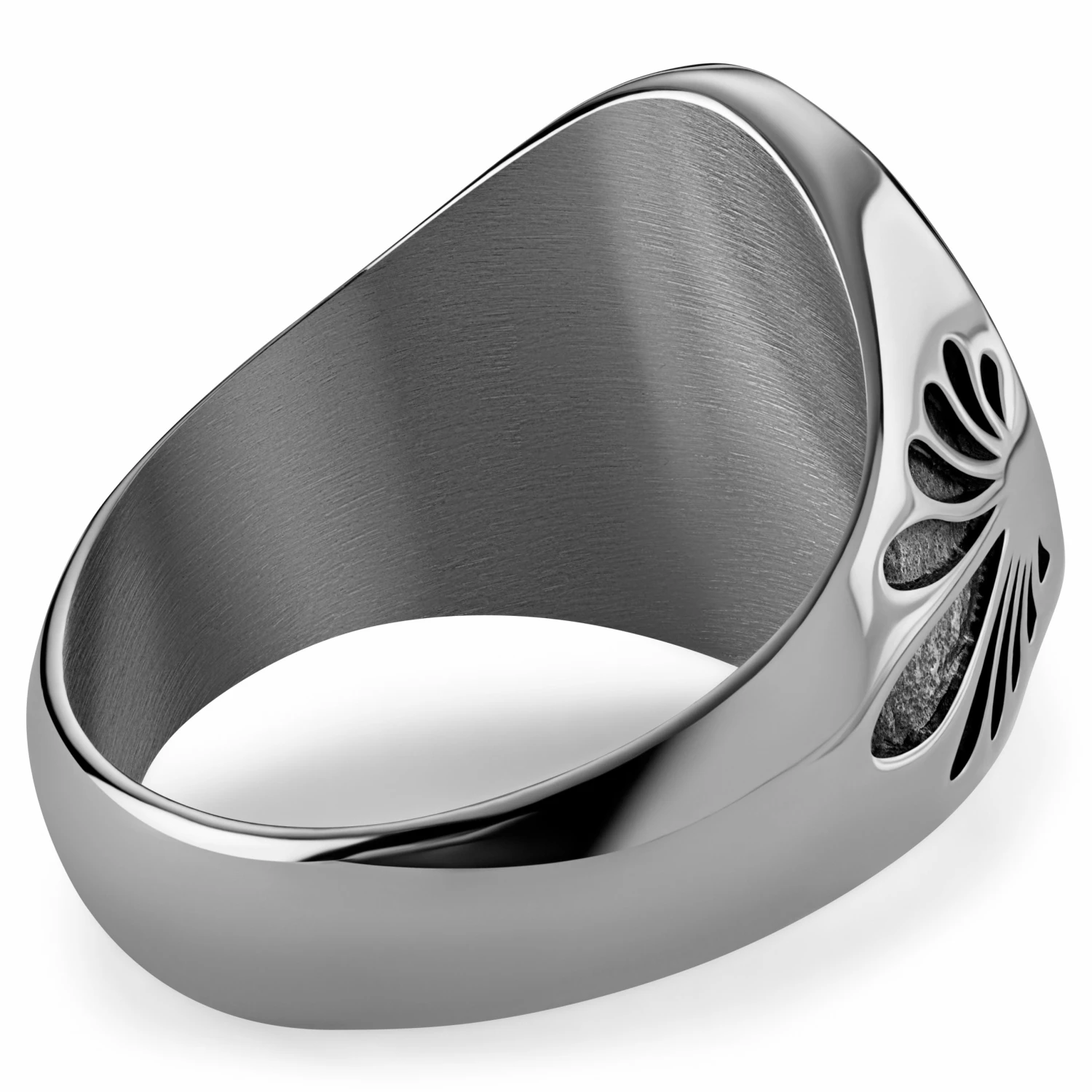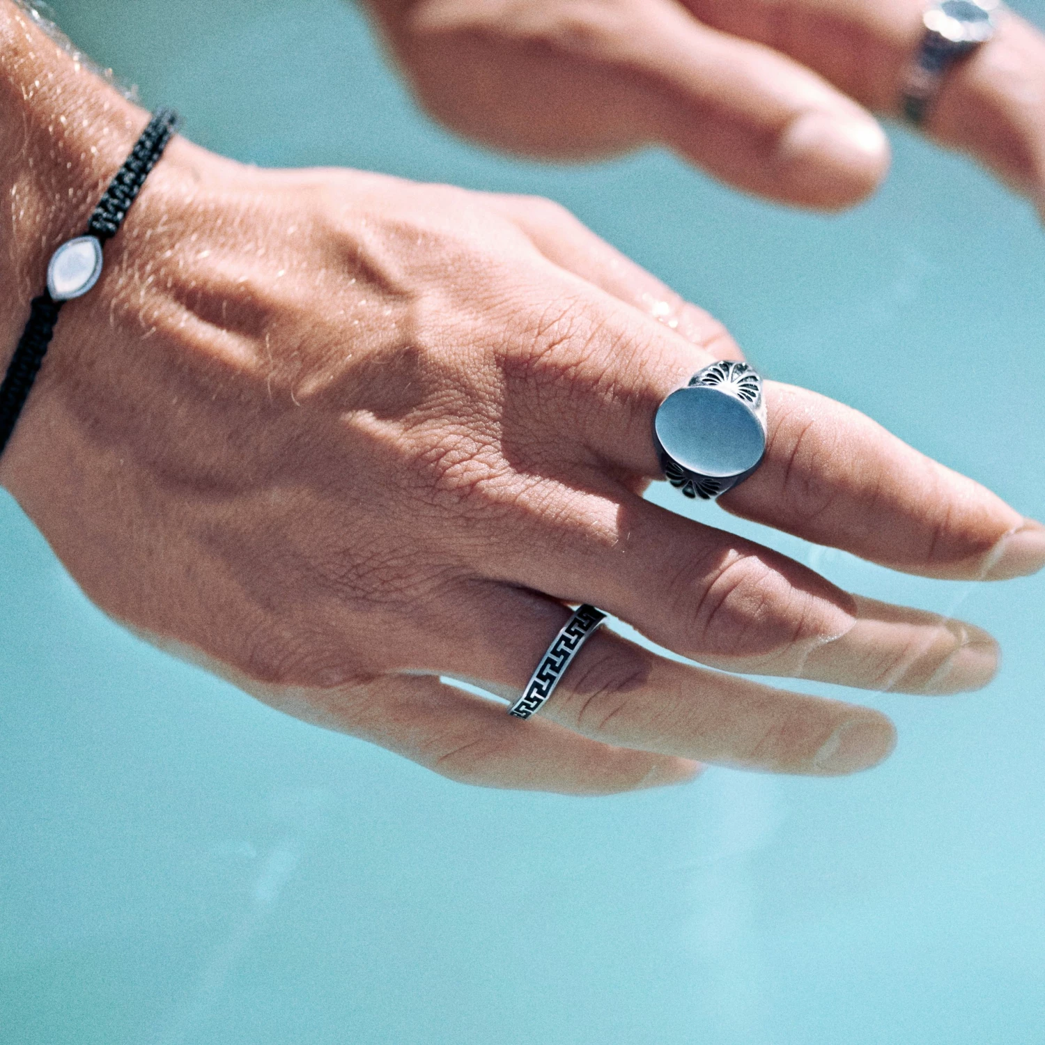 La forme plate et ovale de la face avant de la bague ainsi que sa couleur argentée & polie lui donnent un aspect particulièrement élégant. Sur ses parois latérales, le motif de l’anthémion grec (aussi appelé fleurette) ajoute des détails intéressants à son look. Chaque pétale est dirigé vers l’extérieur, évoquant les pétales des fleurs de lotus et de chèvrefeuille.