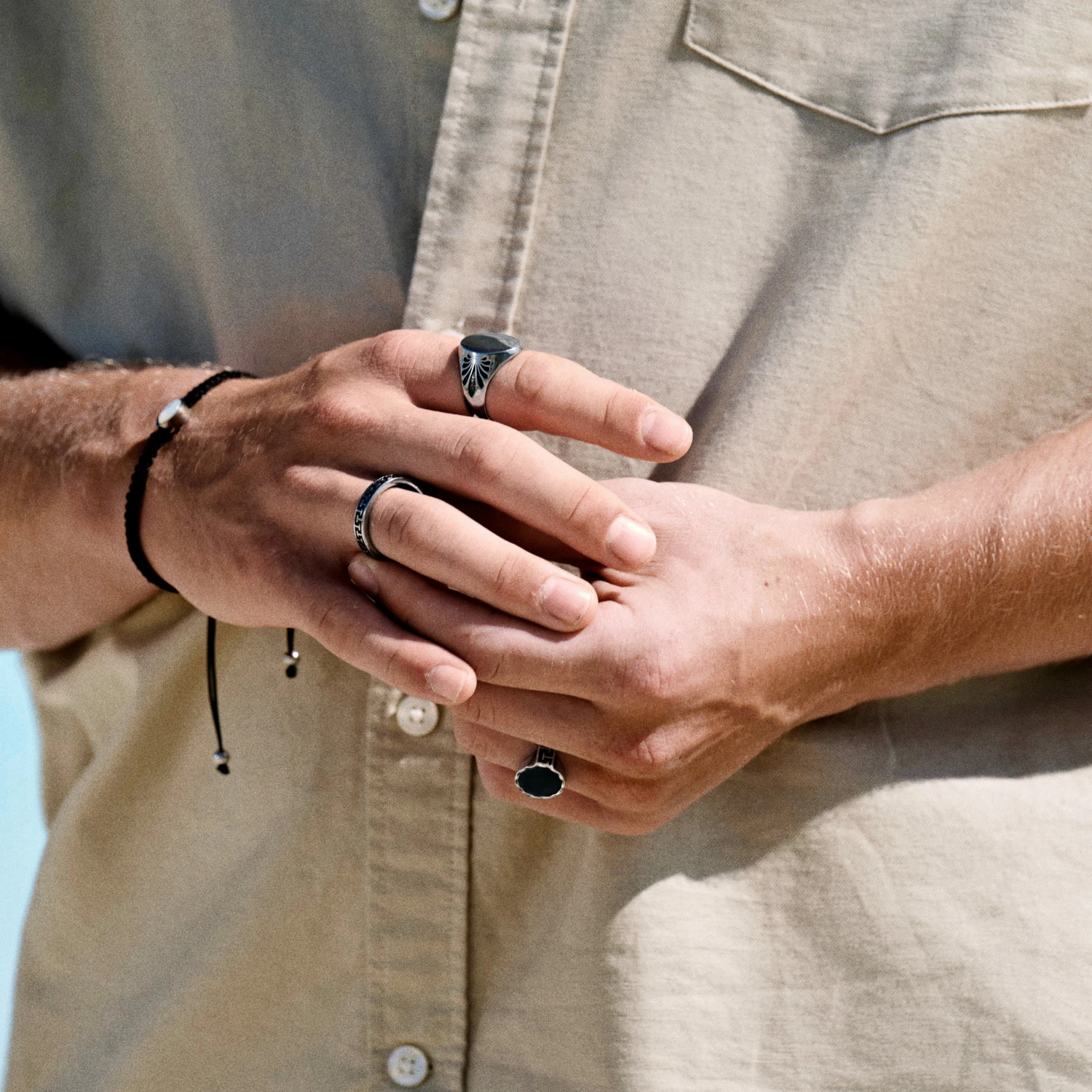 À première vue, le design de cette chevalière classique pour homme semble d’une grande simplicité.